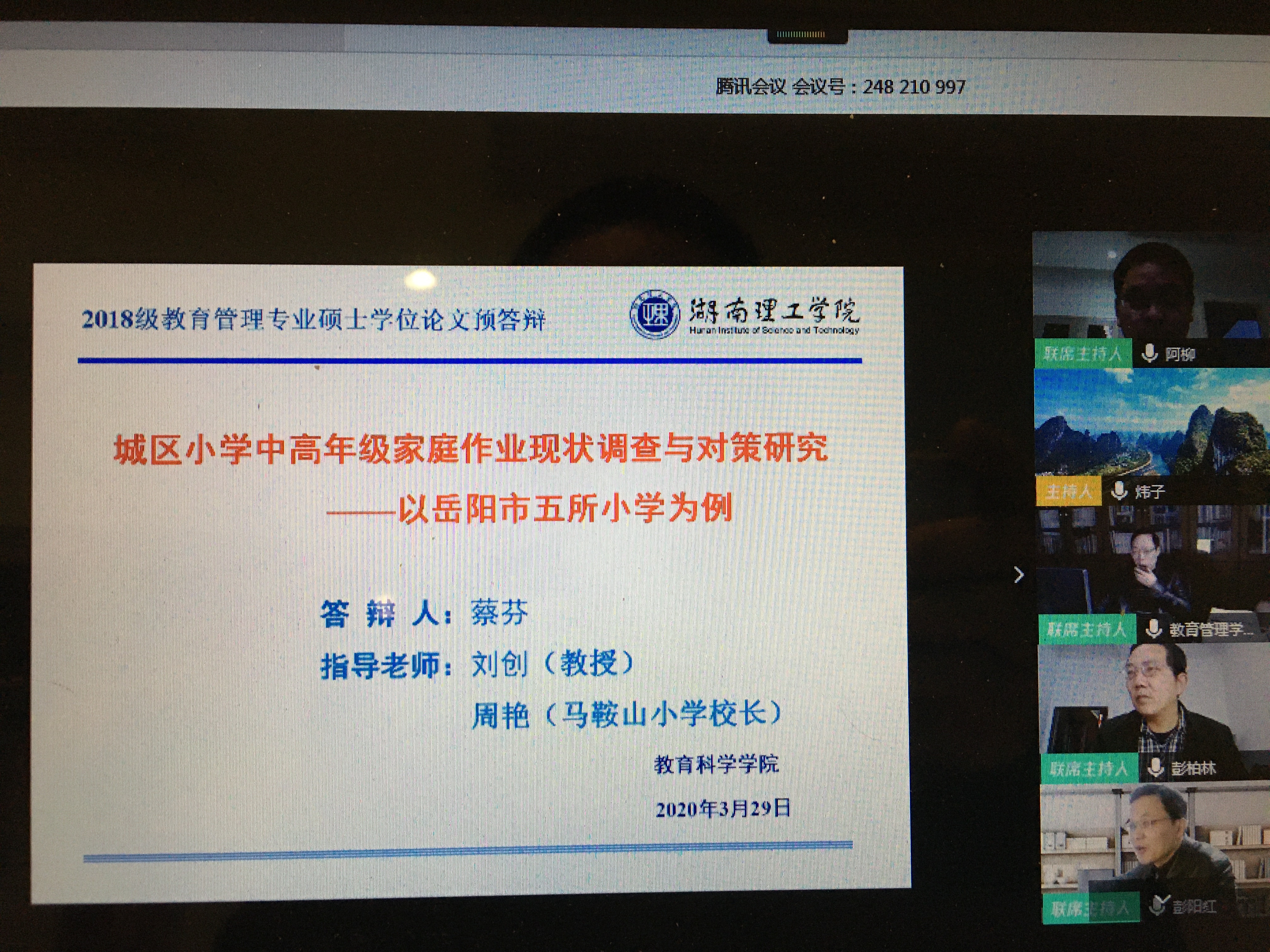 3月29日,教育科学学院通过腾讯会议APP以视频连线方式举行2020届教育管理专业硕士研究生学位论文“云端”预答辩。教育管理专业研究生导师、校党委书记李明云端在线指导答辩。答辩专家委员会由教科院院长刘理、期刊社社长彭柏林、教科院党总支书记刘淳松、岳阳市教育科学与技术研究院中小学正高级教师张金华、教科院副院长彭阳红组成。研究生院党总支书记李丽荣、研究生导师代表王岳斌、研究生院老师黄红霞等在线观摩、指导。答辩秘书王炜利用视频系统进行全程录像录音。