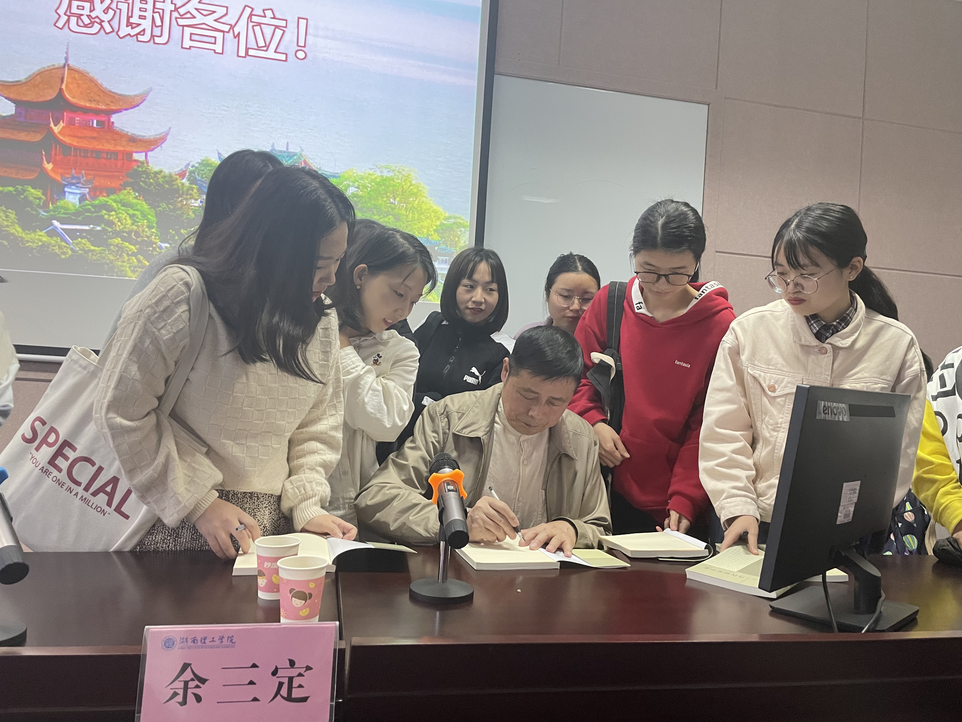 讲座结束后,余三定向在场师生签名赠送自己的著作,鼓励同学们多读书、读好书,并送上自己的美好祝愿:“快乐读书拥书生本色,实在做人持人间常情”。(张瑾 曾婧)