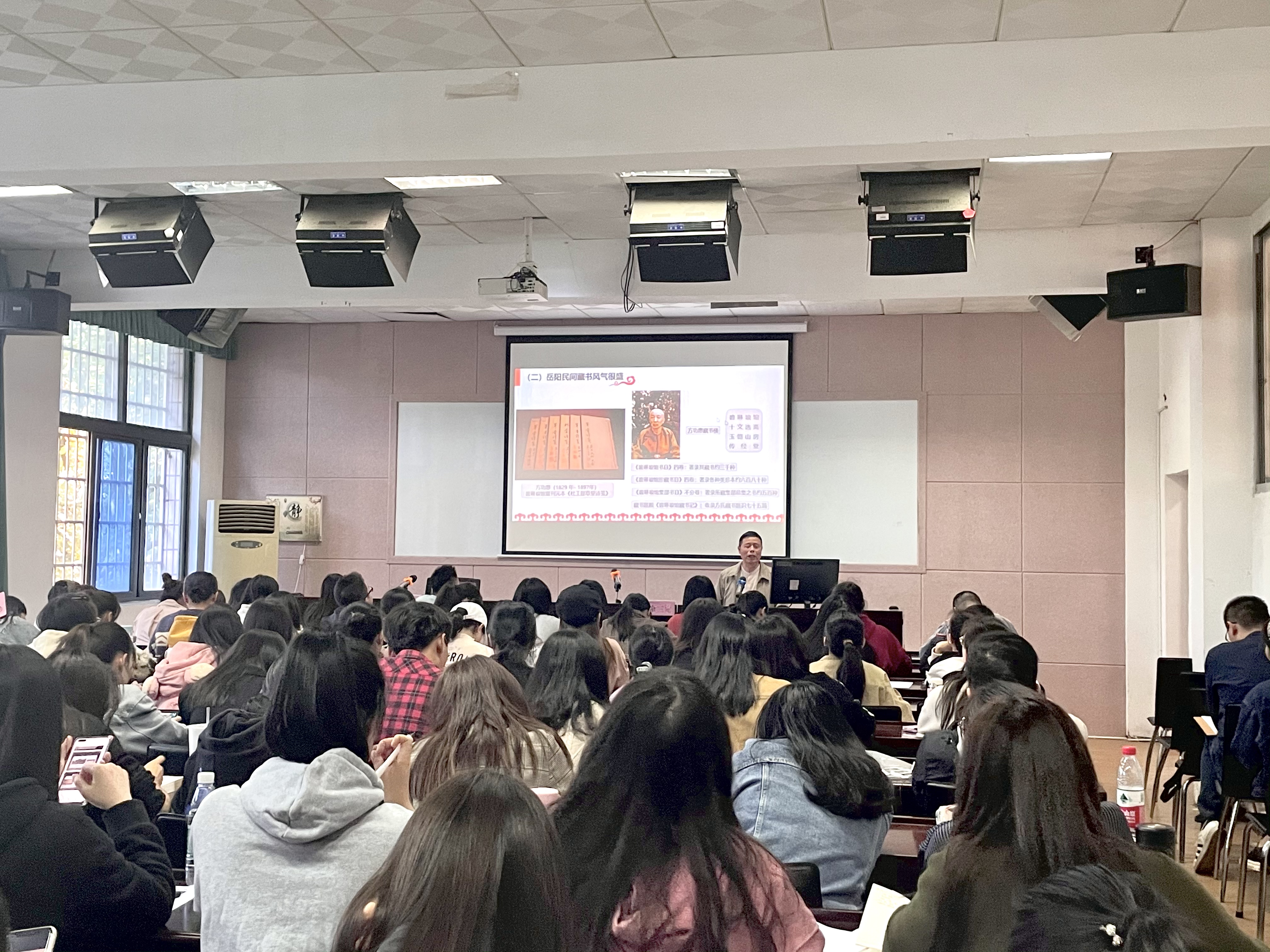余三定以“藏书与读书”为主题,从两个方面展开讲述。一是关于藏书,他以幽默的语言讲述岳阳民间藏书家背后的故事与经历,一同感悟学者大师对藏书的热爱。他介绍了自己的私人藏书楼——“南湖藏书楼”的特点及功能,并提倡家有藏书赶快读。二是关于读书,他提倡快乐读书观,读书是目的快乐和过程快乐的有机统一,教育硕士研究生要自觉阅读专业之外的书籍,读经典好书,多动笔记录并写作。