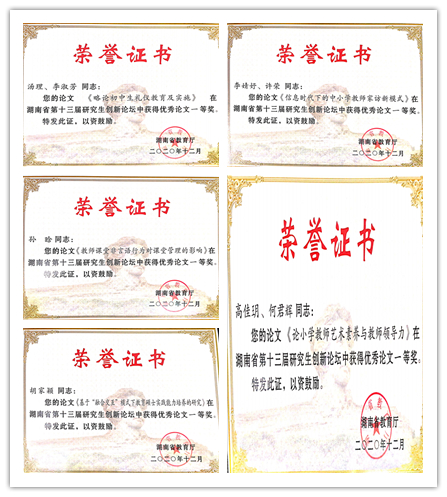 湖南省第十三届研究生创新论坛“教育硕士实践能力提升”分论坛于2020年12月15日完美落幕。本次活动由湖南省教育厅主办、湖南理工学院承办。论坛共收到来自湖南、河南、海南等省八所高校的教育硕士提交的应征论文201篇。经过多轮专家匿名评审,共评选出优秀学术论文一等奖10篇,二等奖23篇、三等奖32篇。教育科学学院非常重视研究生的教育实践能力和创新能力的培养。在此次征文中,学院获奖论文28篇,其中一等奖5篇,二等奖7篇,三等奖16篇。