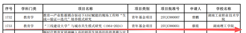 近日,教育部社科司公布了2025年度教育部人文社会科学研究项目立项名单,我院廖霞老师申报的课题《“三线建设大学”与城市共生模式研究(1964—2024)》成功获批青年基金项目。