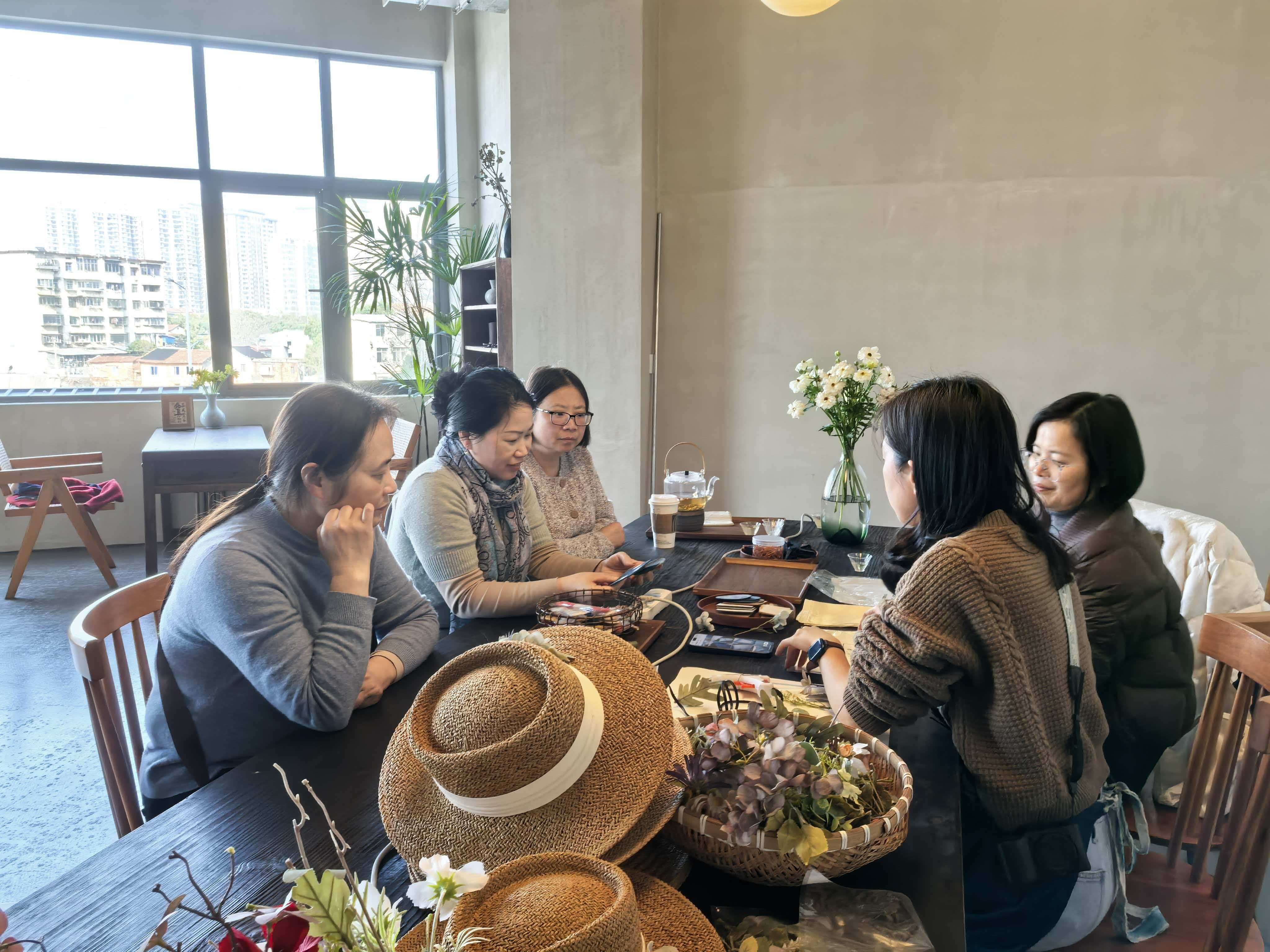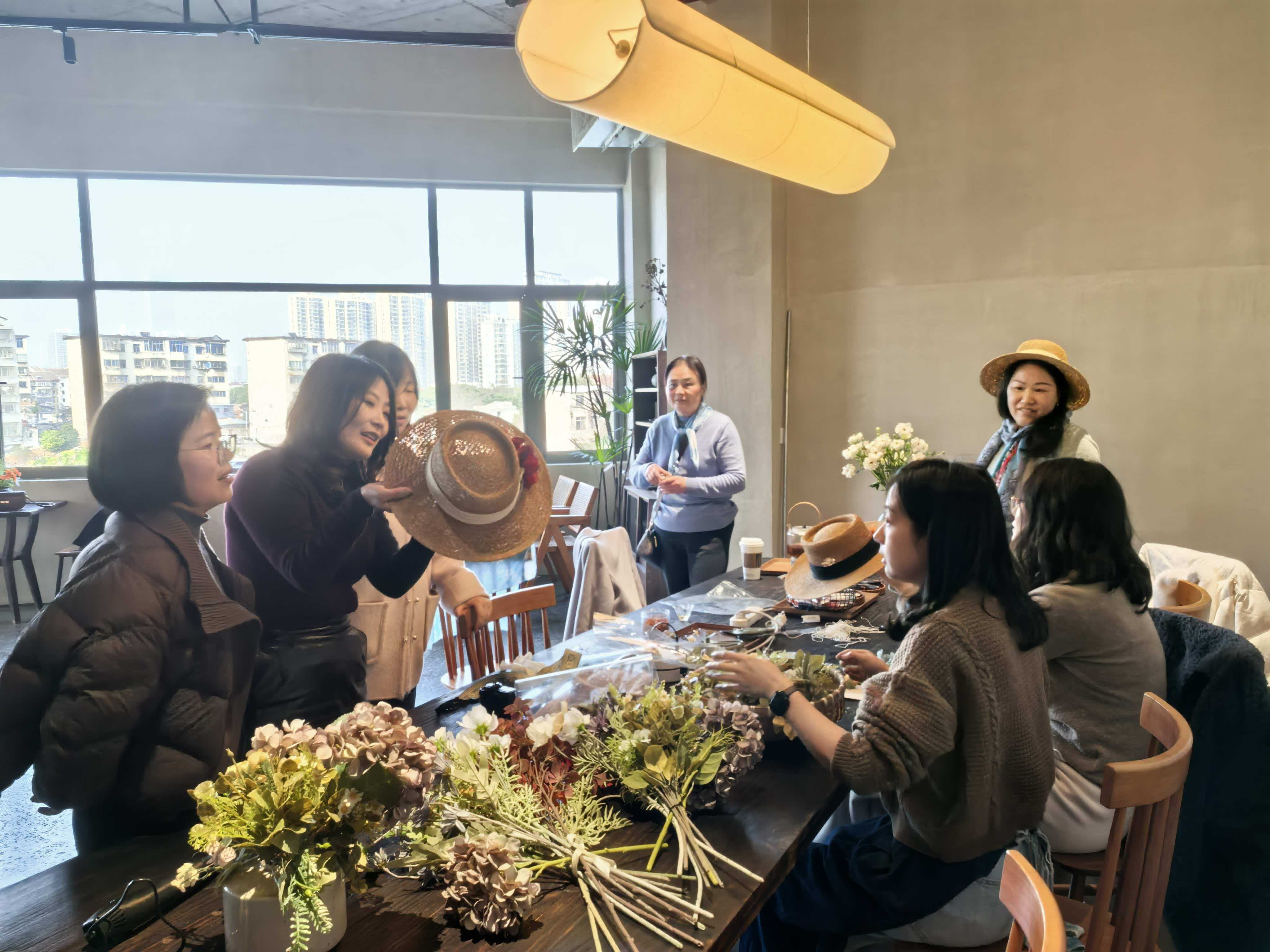 活动现场,女教师们兴致勃勃地体验了法式草帽DIY和丝巾水拓印染。大家巧手翻飞,将普通草帽装点得别具一格,用丝巾定格流动的色彩,在欢声笑语中放松身心,尽显蕙质兰心。