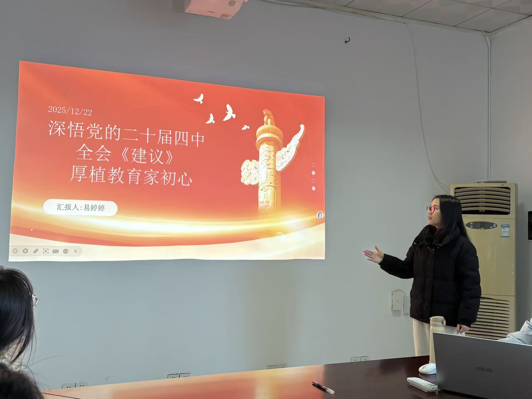 一月一课一片”特色学习活动环节,易婷婷同志“深入学习二十届四中全会精神 弘扬教育家精神”为题讲授了一堂内容扎实、联系实际的“微党课”谭琪同志组织观看并解读了短视频《二十届四中全会精神  十五五规划建议》