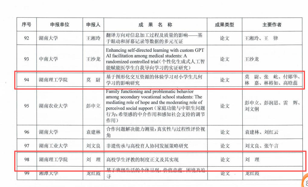 近日,第六届湖南省教育科学研究优秀成果奖名单公布,我院教师两项成果获得二等奖,分别是刘理教授的论文《高校学生评教的制度正义及其实现》和莫尉博士的论文《基于图形化交互资源的体验学习对小学生几何学习的影响研究》。